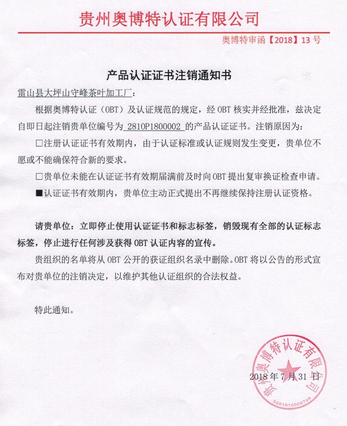 注銷雷山縣大坪山守峰茶葉加工廠產品認證證書通知