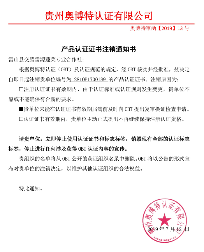 注銷雷山縣交臘雷源蔬菜專業合作社產品認證證書通知