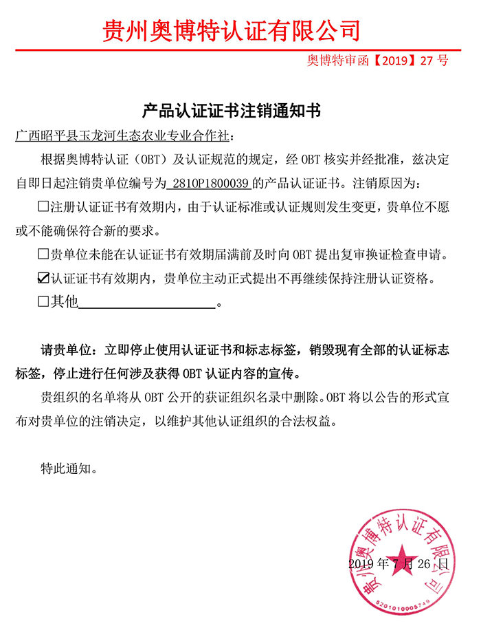 注銷廣西昭平縣玉龍河生態農業專業合作社產品認證證書通知